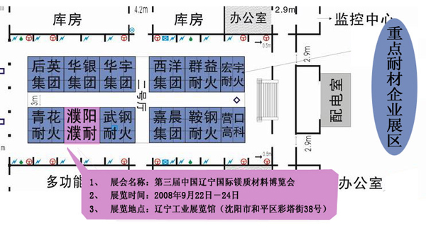 4、濮耐展臺:濮耐展臺面積為81平方,位于遼寧工業(yè)展覽館二號展廳重點耐材企業(yè)展示區(qū)。